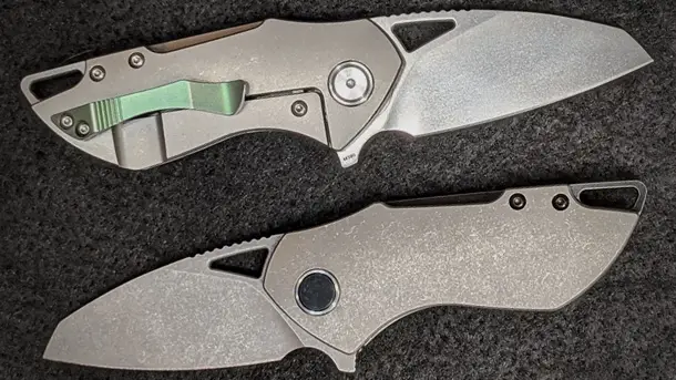 Для создания небольшого клинка, длина которого около 64 мм (режущая кромка 63.5 мм), использована 4 мм порошковая коррозиестойкая сталь марки Böhler M390 с заявленной твердостью на уровне 62 единиц по шкале HRC. Клинок новинки может извлекаться как при помощи небольшого отверстия у основания, так и предусмотренным флиппером. Клинок фиксируется титановым фреймом со стальным ограничителем.