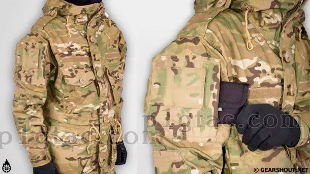 Брюки PSWP выполнены из того же материала, что и куртка. Брюки имеют широкую поясную зону позволяющею использовать ремни шириной до 6 см, также присутствует дополнительная регулировка поясной зоны специальными утяжками. Ягодичная область и область колен усилена дополнительным слоем основного материала, также есть возможность монтажа защитных вставок. Предусмотрены передние прорезные карманы и два накладных набедренных кармана с клапаном на пуговице. Для надежной фиксации набедренных карманов имеется специальная стропа. Комплект PSWP (S11683MC) продается в камуфляже MultiCam и A-TACS AU, стоимость - $170.
